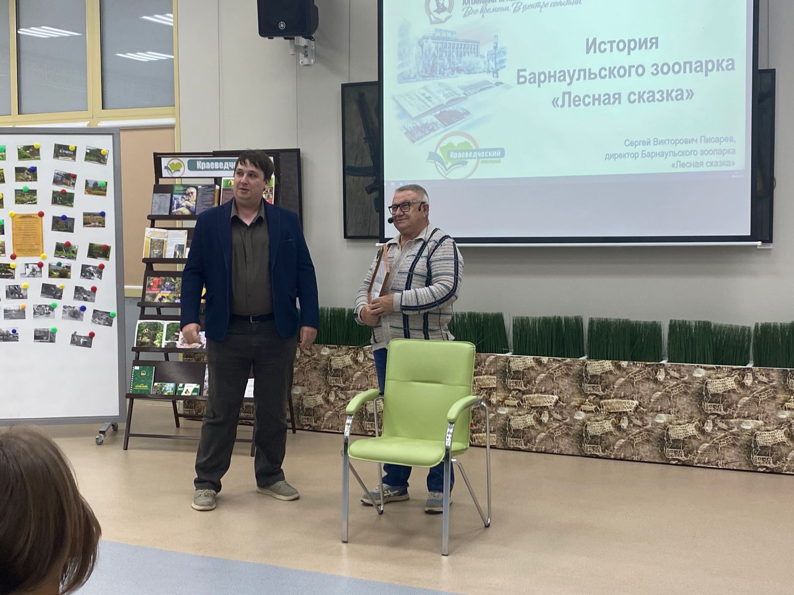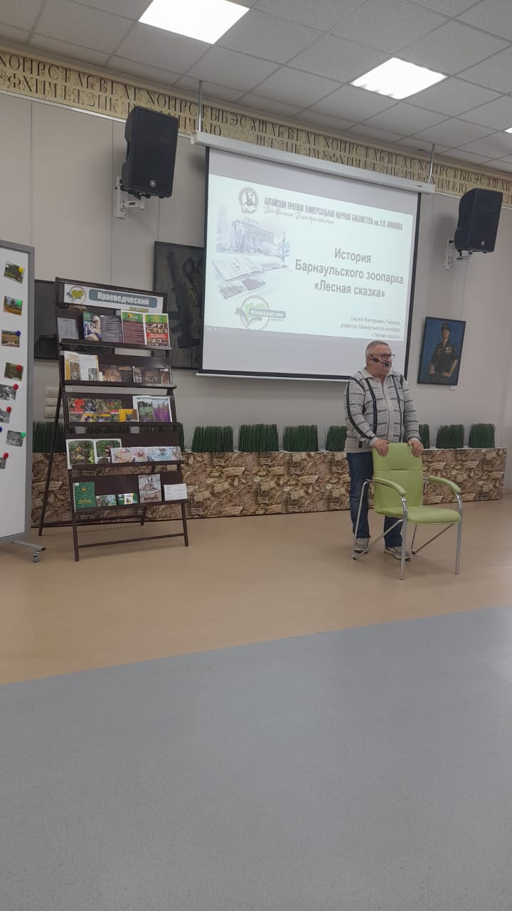 В Алтайской краевой универсальной научной библиотеке им. В. Я. Шишкова 30 сентября состоялся краеведческий лекторий, посвященный истории Барнаульского зоопарка «Лесная сказка». Лектором был Сергей Викторович Писарев, директор зоопарка, член Русского географического общества и Союза писателей России, заместитель председателя комитета по образованию и науке Алтайского краевого Законодательного Собрания.