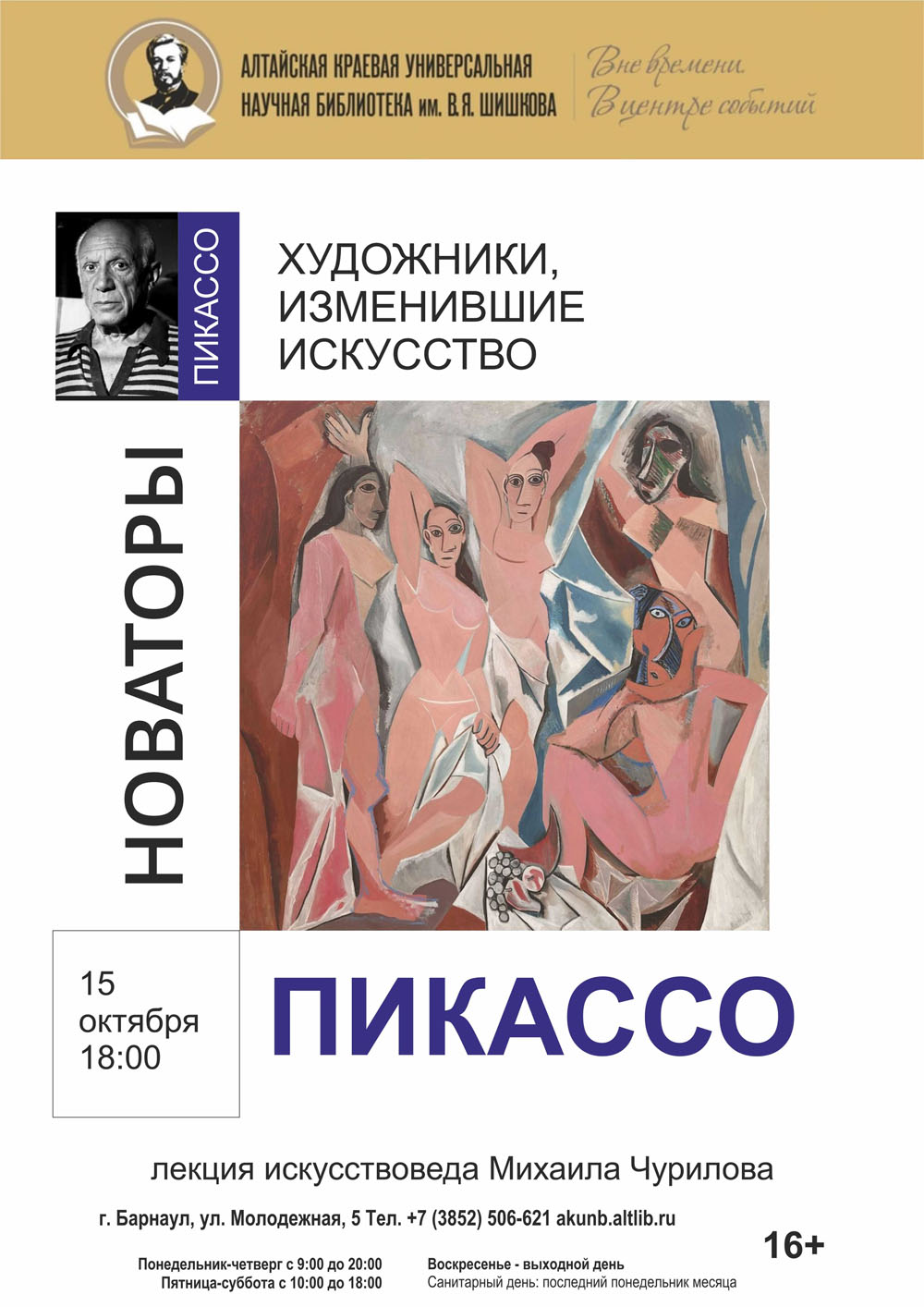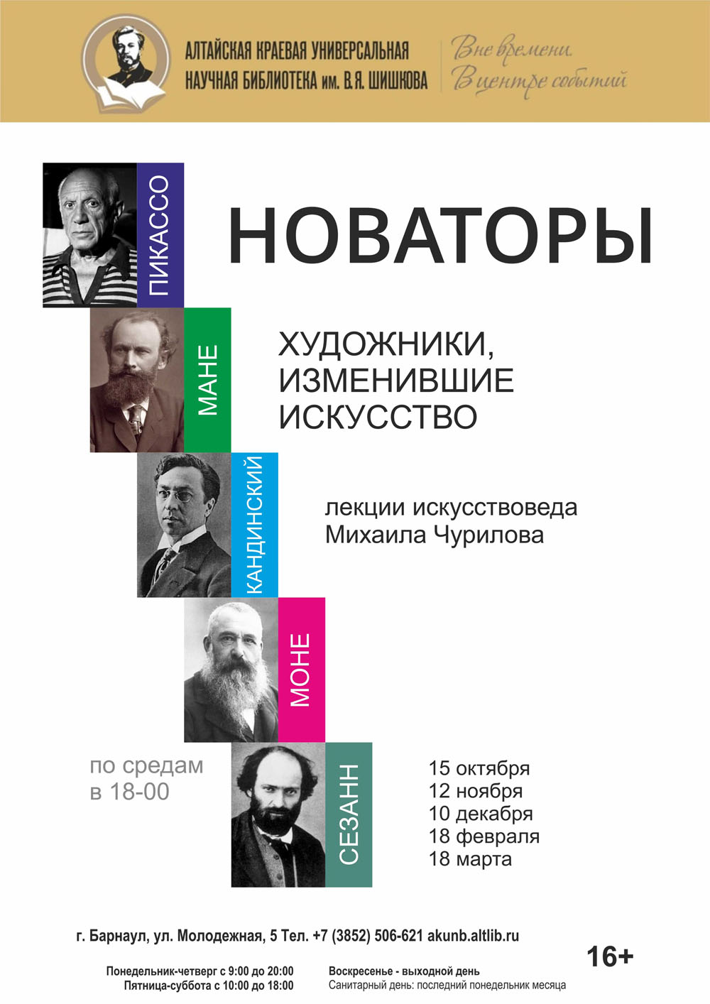 С 15 октября в Алтайской краевой библиотеке им. В. Я. Шишкова начинается восьмой сезон искусствоведческого лектория, бессменным ведущим которого является искусствовед Михаил Чурилов. Публику ждут пять лекций, посвященных Пикассо, Мане, Кандинскому, Моне и Сезанну.