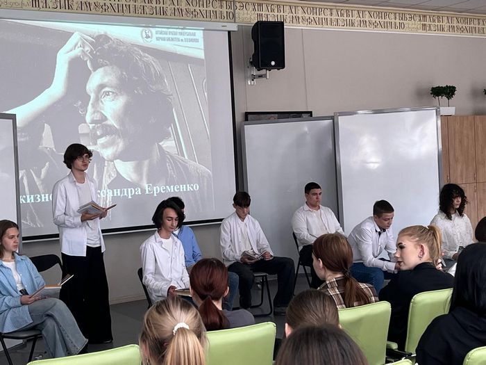 23 октября в краевой библиотеке состоялась литературная композиция «На небеса взобравшийся старатель: пять жизней Александра Еременко», посвященная нашему поэту-земляку. Главными участниками ее были студенты Барнаульского кооперативного техникума.