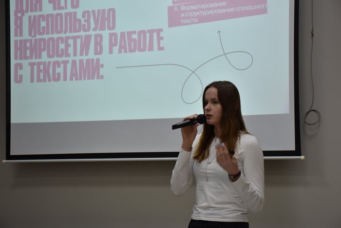 Затем состоялось практическое занятие «Работа с текстовыми и графическими нейросетями» от ведущего библиотекаря сектора «Региональный центр доступа к информационным ресурсам Президентской библиотеки имени Б. Н. Ельцина» Алёны Алексеевны Варёновой. Студенты 4-го курса кафедры «Библиотековедение и информационные технологии» Алтайского государственного института культуры научились создавать иллюстрации для афиш, визуальный контент для соцсетей и даже генерировать обложки для книг, освоили написание аннотаций, постов для блогов, сценариев мероприятий и автоматизацию рутинных запросов.