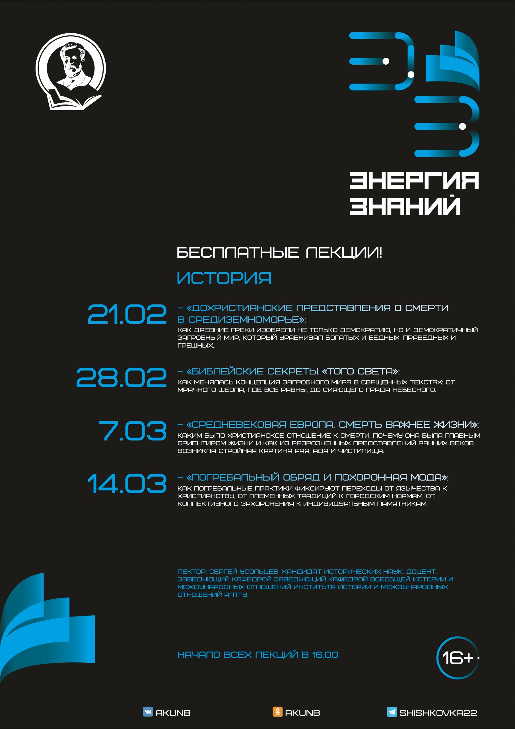 В предыдущих сезонах проекта «Энергия знаний» гости «Шишковки» уже погружались в математику и химию, биологию и географию, медицину и краеведение, музыку и литературу, психологию и психиатрию. И три сезона были посвящены истории в разных ее аспектах, и каждый прошел с аншлагом! Бессменным лектором этих сезонов выступил Сергей Усольцев, кандидат исторических наук, доцент, заведующий кафедрой заведующий кафедрой всеобщей истории и международных отношений Института истории и международных отношений АлтГУ. Он снова с нами и готов прочитать курс лекций, тема которых волнует человечество, пожалуй, с самого зарождения цивилизации. Характеризуя тематику, Сергей Усольцев говорит, что это будет цикл лекций об истории идей и эволюции воображения. «История — это не только битвы и деяния королей. История — это эволюция нашего воображения. Нам часто кажется, что «общечеловеческие ценности» вечны, а люди прошлого были такими же, как мы, просто без электричества. Но это иллюзия. Они иначе любили, иначе договаривались и.… совершенно иначе умирали. Вместе с развитием общества менялись не только технологии, но и наши представления о финале. Загробный мир — это, пожалуй, самый грандиозный коллективный проект человечества. Тысячелетиями люди чертили карты потусторонних земель, проектировали архитектуру Ада, сочиняли похоронные обряды. Потому что в том свете отражается этот. И, изучая историю смерти, мы на самом деле изучаем историю человеческой жизни. Мы приглашаем вас в путешествие по истории смерти — без страха и мистики. Только факты и история идей».